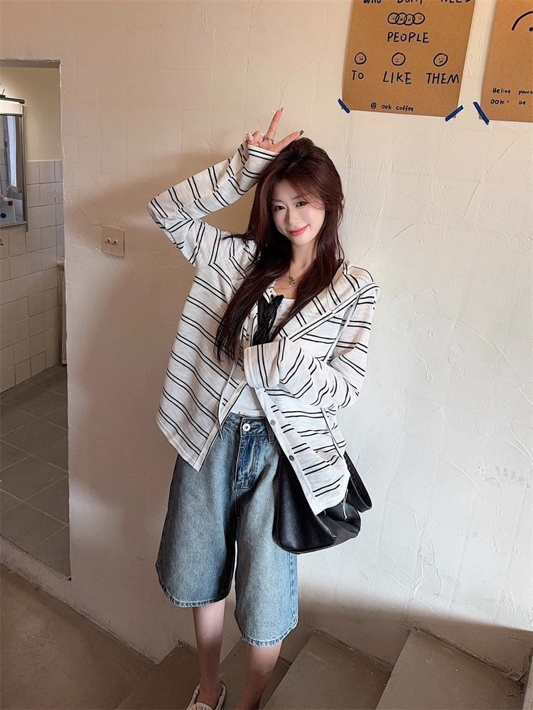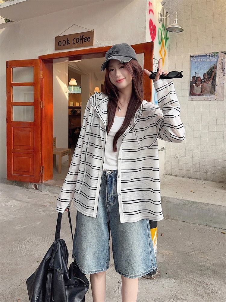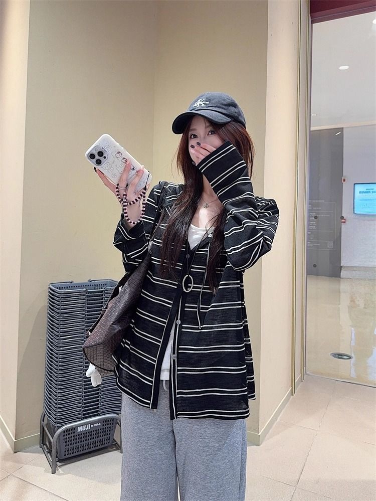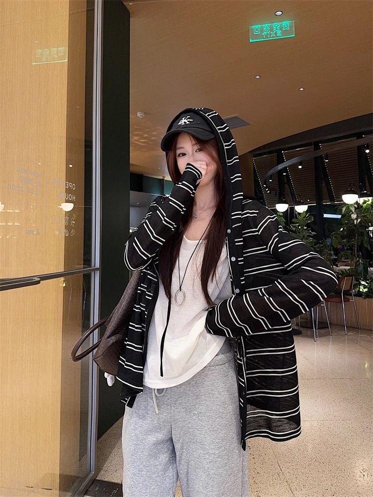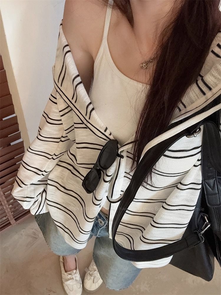 Striped Hooded Jacket for Women, Lightweight Long Sleeve Sun Protection Cardigan, Lazy Style Loose Top
