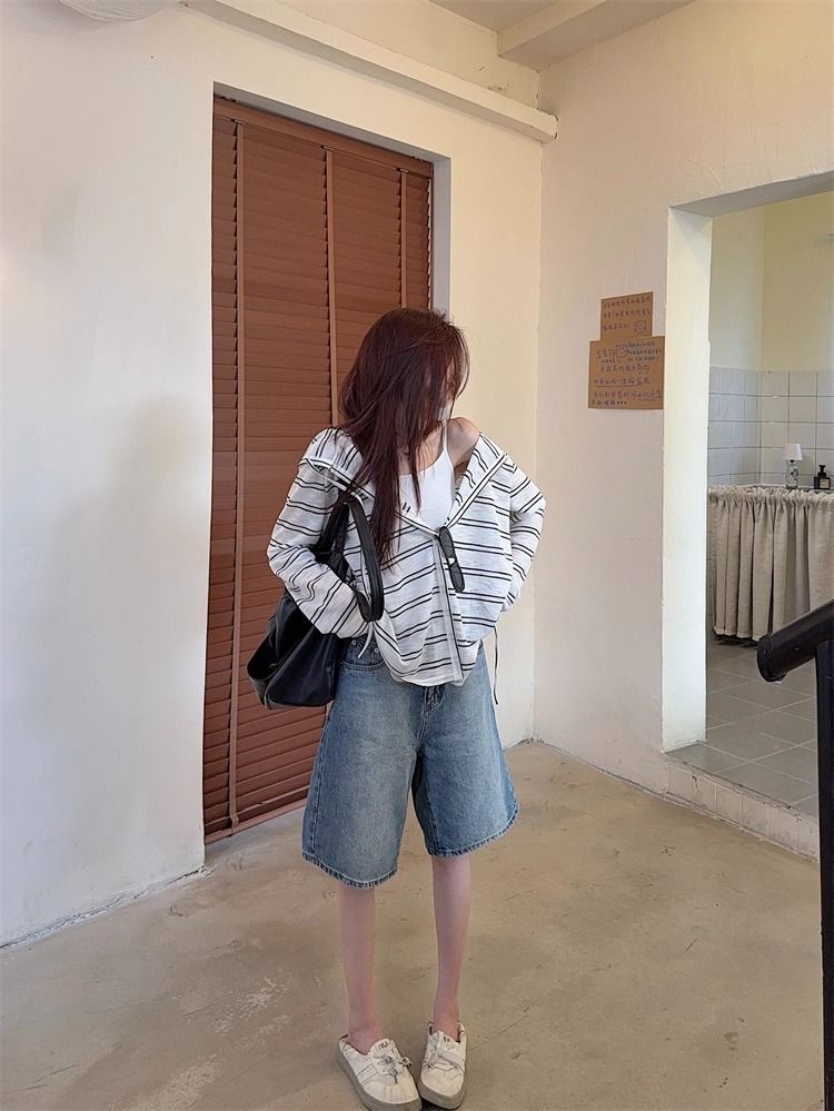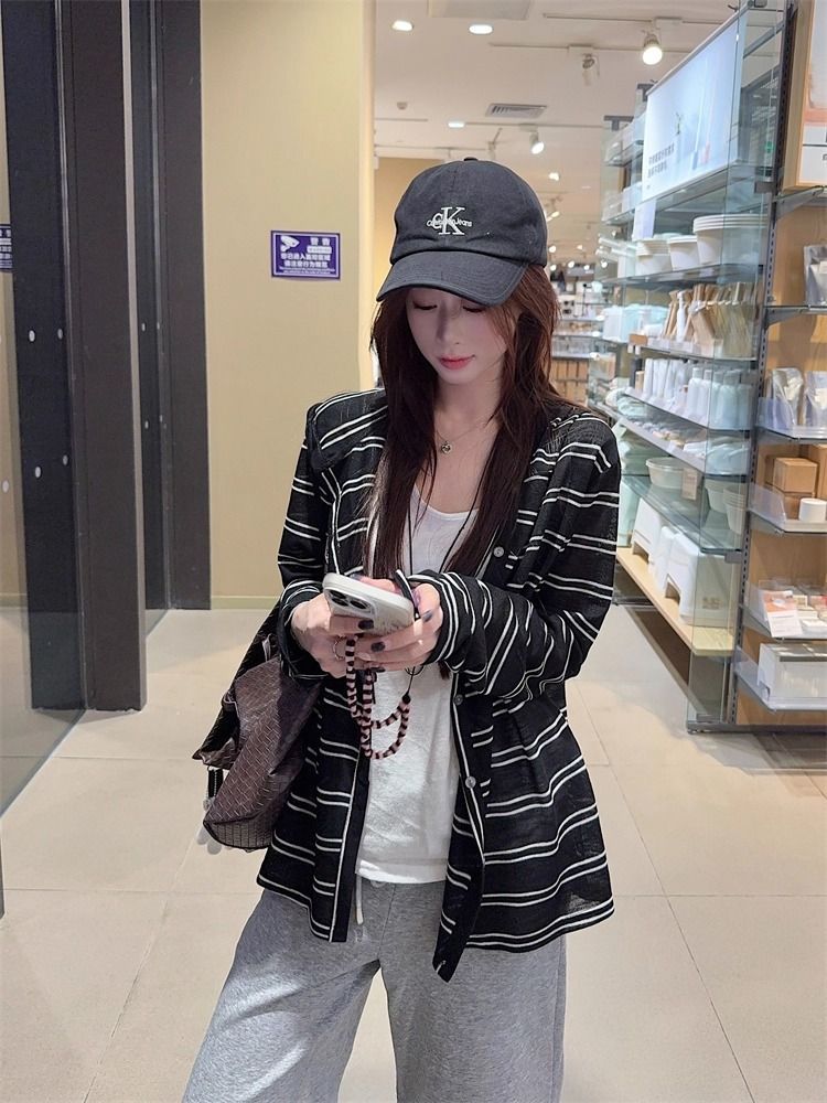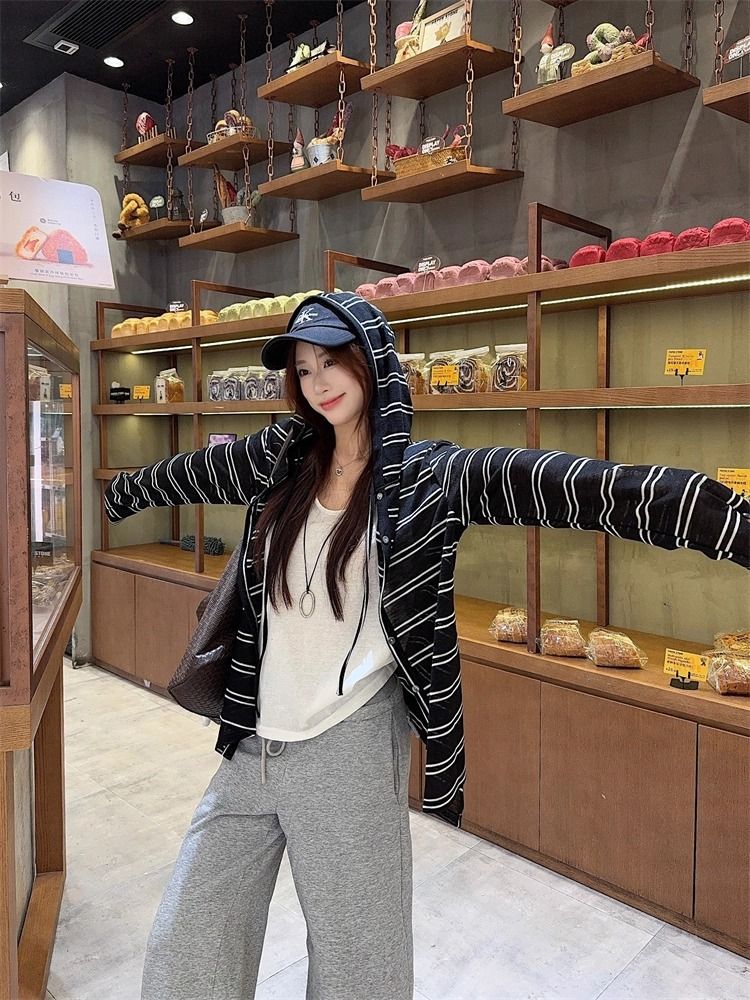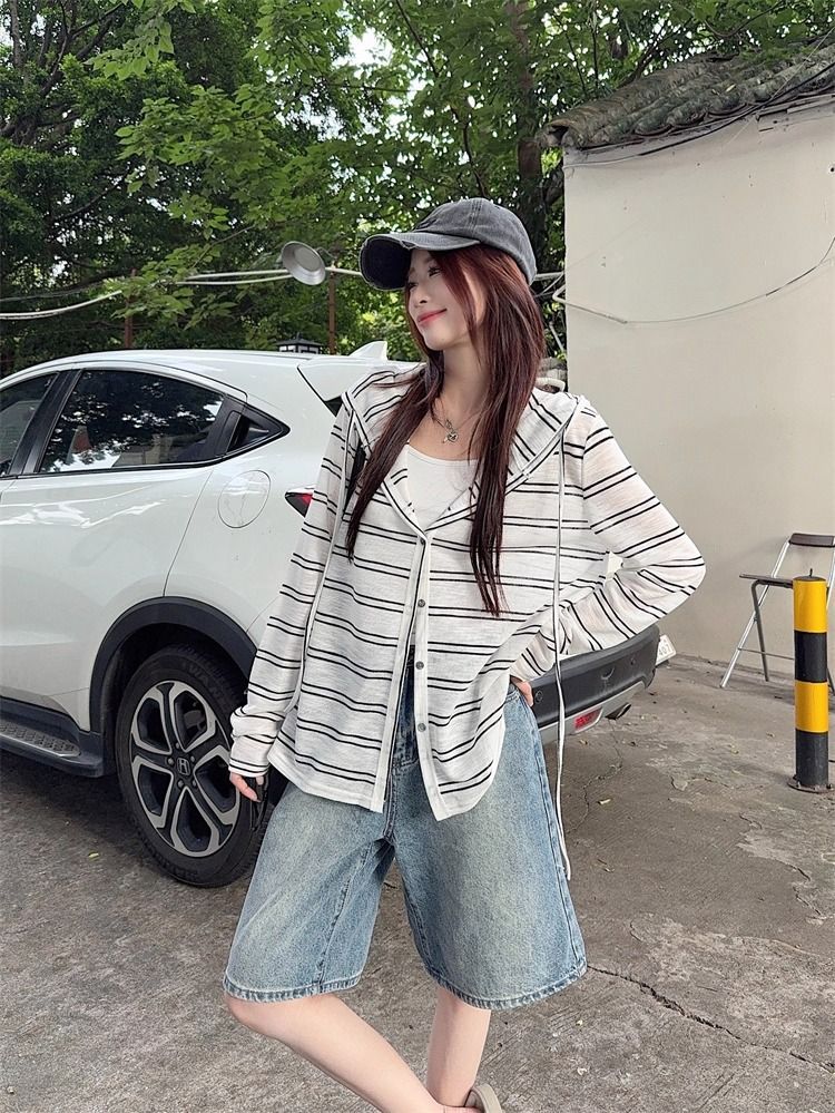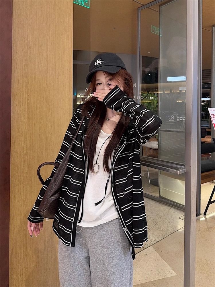 Striped Hooded Jacket for Women, Lightweight Long Sleeve Sun Protection Cardigan, Lazy Style Loose Top