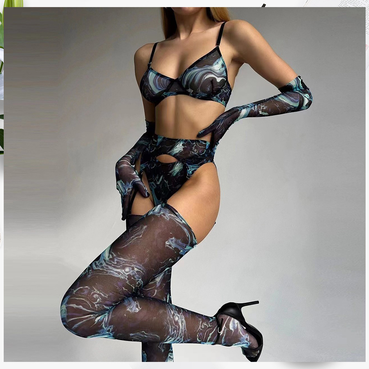 Tie-Dye Colorful Small Bust Gathering Mesh Sexy Lingerie Five-Piece Set for Women