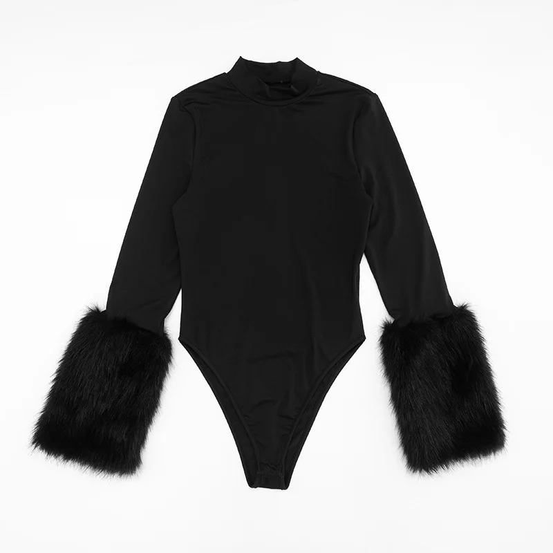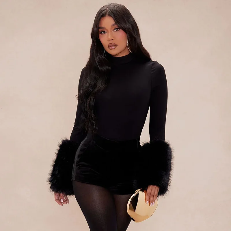 Winter Sexy Outfits for Woman 2 Piece Set Long Sleeve Fur Patchwork Bodysuit and Shorts Sets Female Matching Streetwear 2025 New